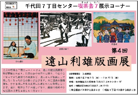 2月の喫茶去7展示コーナーでは、第4回遠山利雄版画展が開催されます。遠山さんの止まるところを知らない創作意欲からは、過去の作品を新たな角度から捉え直す探究心や、鮮やかな色合いへのこだわりが感じられ、幅広い関心と繊細な技巧が作品の随所に表れています。進化し続ける遠山作品を是非喫茶去7にてご堪能ください✨