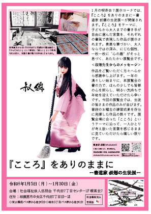 1月の喫茶去7展示コーナでは、『こころ』をありのままにー書道家 叔僊の生徒展ーが開催されます。『こころ』をテーマに、子どもから大人までの書き手が自由に選んだ言葉を、それぞれの書風で表現した作品が展示されます。素直な筆づかい、大人ならではの深み、にじむ個性、一枚一枚に“心の趣”がそっと息づく、あたたかい展覧会です。